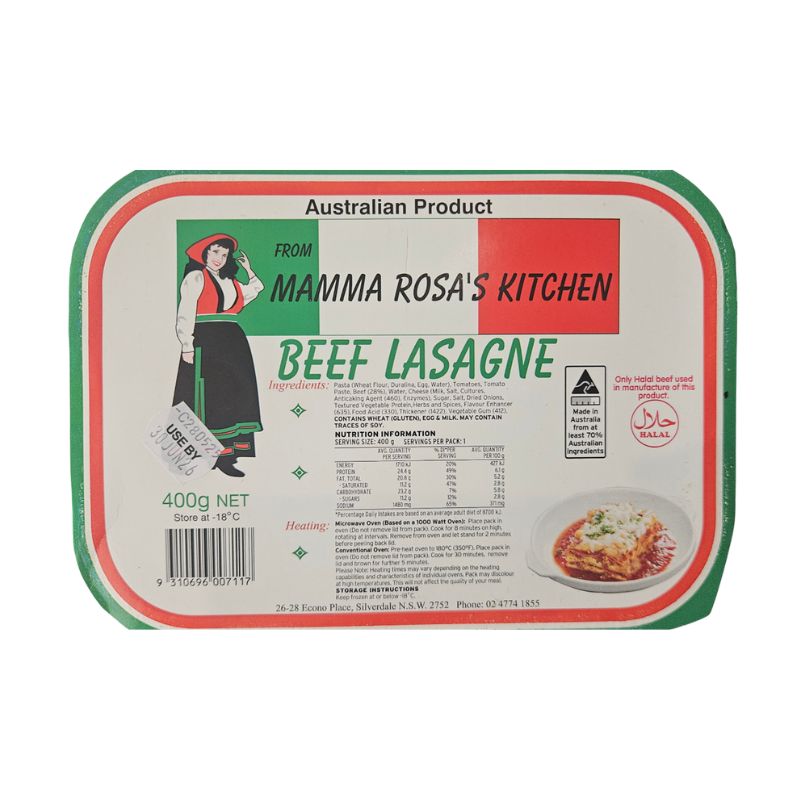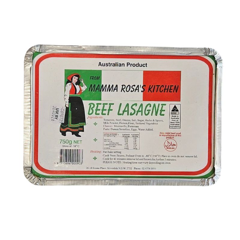 Mamma Rosa’s Beef Lasagne is a popular frozen, pre-made Italian-style meal featuring layers of pasta, 100% Australian premium minced beef, tomato sauce, and creamy béchamel, topped with mozzarella and parmesan cheese.